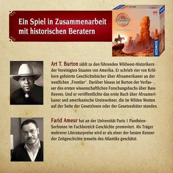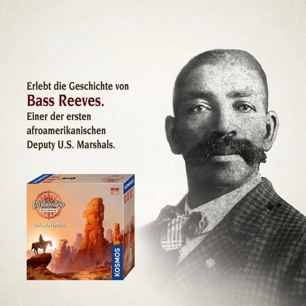 Mit Cartaventura steht eine kompakte Abenteuerspielreihe bereit – basierend auf historischen Fakten und mit einfachen Regeln. 1-6 Spieler können direkt in die Geschichte eintauchen – und die spielt bei Cartaventura Oklahoma im wilden Westen. Bass Reeves wird in der Zukunft der erste afroamerikanische Sheriff der USA. Doch der Weg dorthin ist nicht einfach. Die Regelkarten führen schnell in das Setting ein, danach geht es auf die Spuren des berühmten Gesetzeshüters. Welche Gefahren lauern auf Bass? Einige Karten bringen neue Orte ins Spiel, andere stellen das Team vor Entscheidungen. Karte für Karte entwickelt sich die ungewöhnliche Biografie des Sheriffs weiter. Auf ins Abenteuer!Art.-Nr.: 1877579