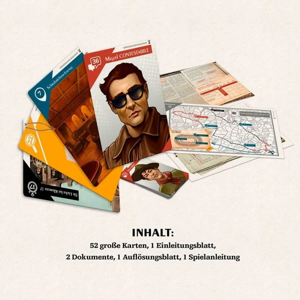 | Inhalt/Ausstattung | 52 große Karten, 1 Einleitungsblatt, 1 Auflösungsblatt, 2 Dokumente, Spielanleitung | ||