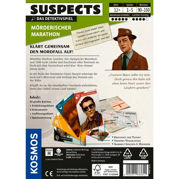 London, 1948. Im weltberühmten Wembley Stadion warten alle auf das Ereignis des Jahres: Den olympischen Marathonlauf. Die Zuschauer jubeln, als der Startschuss fällt. Aber etwas stimmt nicht. Hier muss die Detektivin Claire Harper ran! Wer ist der Mörder oder die Mörderin? 1-5 Spielerinnen und Spieler ermitteln an einem sagenumwobenen Ort. Dafür entschlüsseln sie Karten, untersuchen den Tatort und vernehmen Verdächtige. Schaffen sie es, die geheimen Machenschaften aufzudecken?Art.-Nr.: 1904857