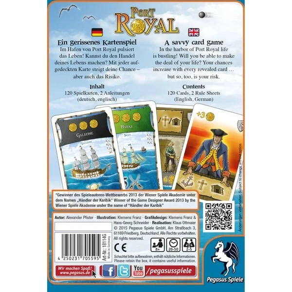 Die Karibik im goldenen Zeitalter der Piraterie: Große Gefahren lauern in diesen Gewässern. Doch die Aussicht auf unermesslichen Reichtum rechtfertigt so manches Risiko. Die Spieler begeben sich in Port Royal auf die Suche nach einer schlagkräftigen Crew und versuchen gierige Freibeuter zu meiden. Nur wer wagt, wird seinen Einfluss steigern und schließlich einem königlichen Expeditionsaufruf folgen können. Aber wer zu viel riskiert, läuft Gefahr, alles zu verlieren. Port Royal ist ein mehrfach ausgezeichnetes, schnelles Kartenspiel mit der vollen Breitseite Piraten-Flair. Dank der einfachen Regel können die Spieler sofort in See stechen und bei der Erkundung fremder Gewässer ihren Mut beweisen.Art.-Nr.: 1346924