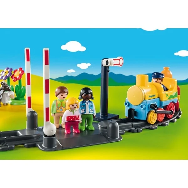 Tuff tuff tuff… Geh auf Reisen mit der Eisenbahn von PLAYMOBIL 1.2.3 und entdecke freundliche Tiere sowie schöne Blumen. Die Fahrgäste nehmen Platz im Personenwagen. Das Gepäck wird mit dem Güterwagen transportiert. Mit Tunnel, Bahnübergang und Bahnsignal. Dank Schiebefunktion ist die Eisenbahn bereits perfekt für die Kleinsten geeignet.Art.-Nr.: 1491667