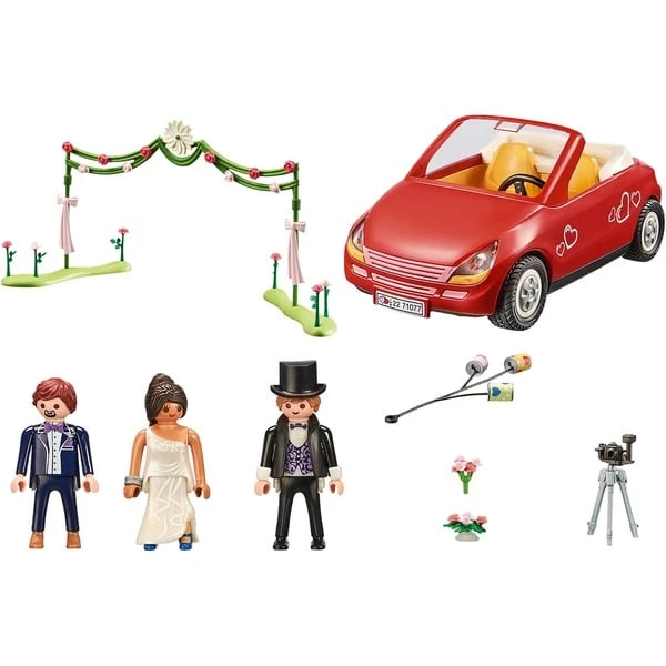 | Inhalt/Ausstattung | Figuren: Bräutigam, Braut, Fotograf, Zubehör: Auto, Fotoapparat, Dose, Hochzeitsdeko, Blumenstrauß | ||