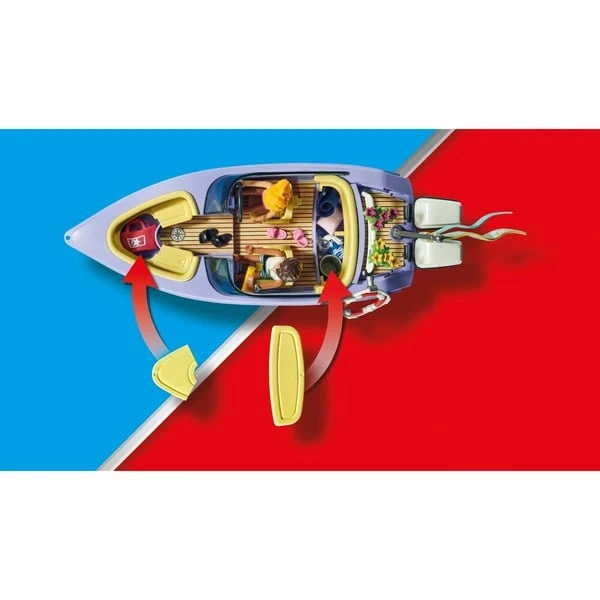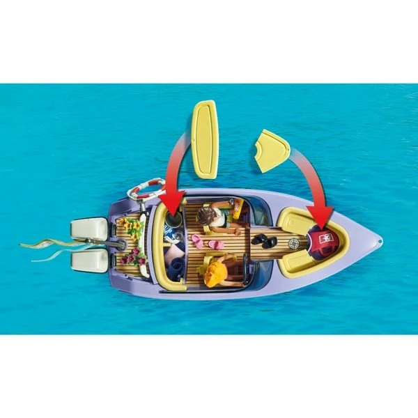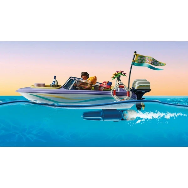 Frisch getraut startet das verliebte Paar aus PLAYMOBIL City in seine Hochzeitsreise. Dafür haben die beiden extra ein Motorboot gemietet. Mit Schwung fahren sie hinaus aufs Meer, dort wird erst einmal eine Pause eingelegt. Die Frischvermählten setzen sich auf das Sonnendeck und genießen das tolle Wetter. Anschließend ziehen sie die Badesachen an und springen ins Wasser. Diese Flitterwochen werden ein wunderbares Erlebnis!Art.-Nr.: 1888865