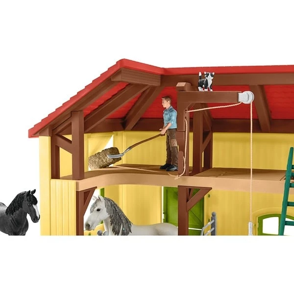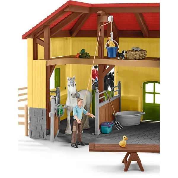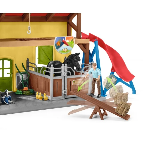 | Inhalt/Ausstattung | Pferdestall mit 2 Pferdeboxen, 7 Tieren (Shire Stute, Shire Hengst, 3x Entenküken, 1x Kätzchen, Maus), 2 Spielfiguren (Bauer Paul, Bäuerin Laura), Sattel, Futterrutsche, Wippe, Trog, 4x Paddocks, Leiter, 1x Äpfel (grün), 1x Karotten, 1x Heuballen, 1x Grashaufen, Mistgabel, 1x Eimer, 2x Futterraufen, 1x Striegel, Putzkiste, Sticker, Fütterungsanzeige | ||