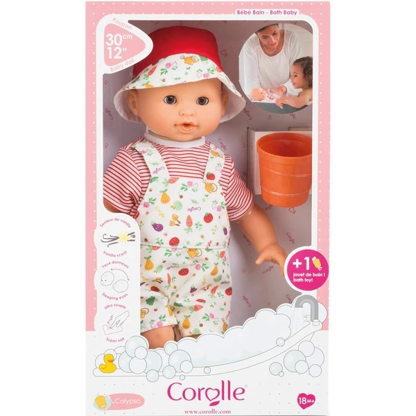 Diese etwa 30 Zentimeter große Weichkörper-Badepuppe, die ihren Daumen im Mund behalten kann, trägt ein süßes Bade-Outfit aus T-Shirt und Latzhose mit Gemüseaufdruck und einen passenden Sonnenhut. Das Outfit kann auch ausgezogen werden. Mit dabei ist auch ein kleiner orangenfarbener Becher mit Löchern im Boden zum Wassersieben. Die Babypuppe eignet sich zum Spielen in der Badewanne und kann anschließend zum Trocknen an einer eingenähten Lasche in der Kleidung aufgehängt werden. Die Schlafaugen lassen die Puppe friedlich ihre Augen schließen, wenn sie hingelegt wird. Mit ihrem geringen Gewicht ist sie auch für kleine Kinder leicht zu tragen und daher gut zum Kuscheln und Umarmen geeignet. Wie alle Corolle-Puppen riecht sie angenehm zart nach Vanille.Art.-Nr.: 1730400